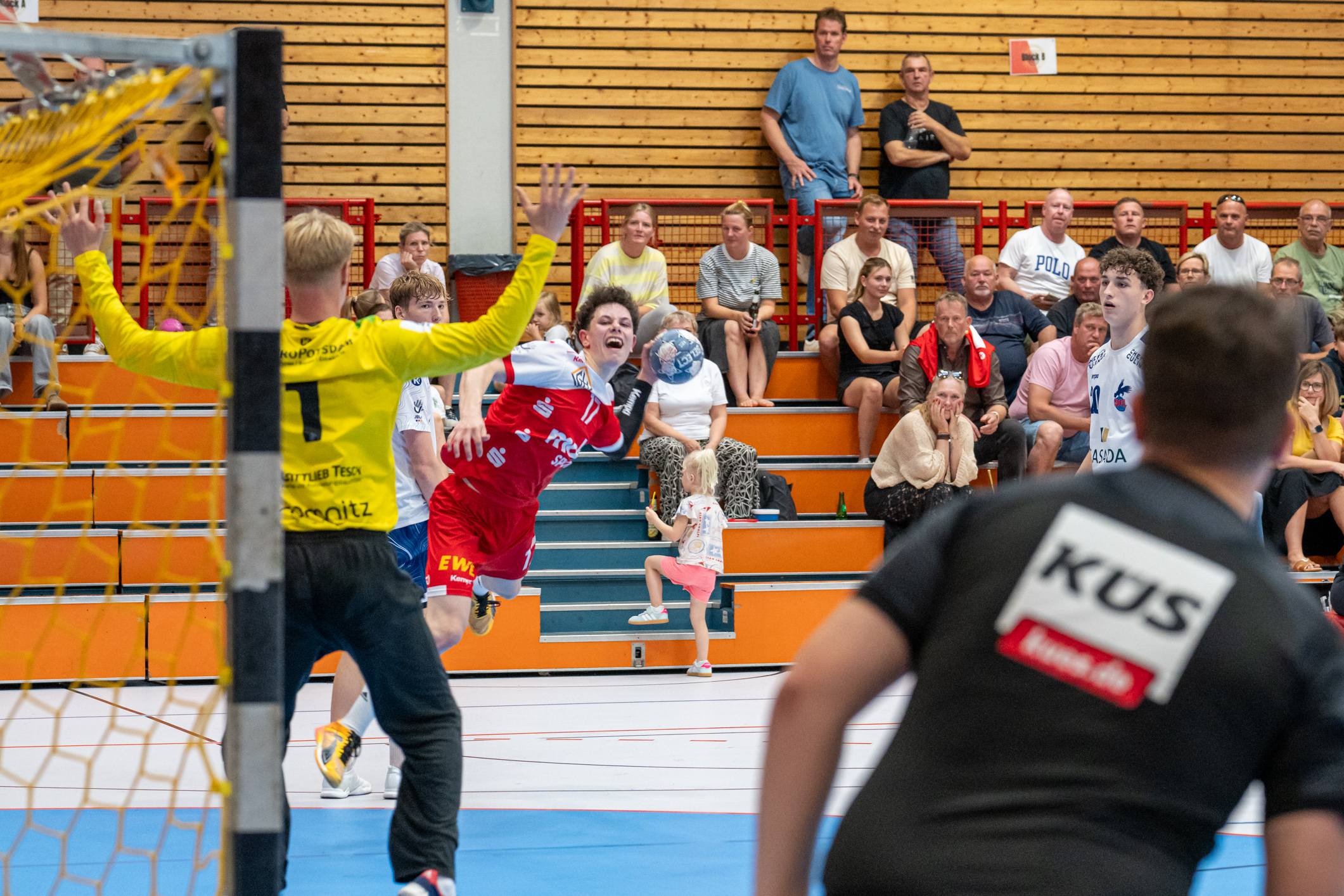 Bis zum 13:13 konnten die Schützlinge der Trainer Stefan Hagedorn und Carsten Brinkmann gegen den großen Favoriten das Spiel ausgeglichen gestalten bzw. führten teilweise mit 2 Toren. Dabei wurden die Tore hervorragend herausgespielt und spielerisch war zwischen beiden Teams kein Unterschied zu erkennen. Leider bekam das Team gerade in nummerischer Überzahl durch zwei Fehlwürfe einen 0:3-Lauf, so dass die Magdeburger sich zur Halbzeit auf eine 21:17 Führung das erste Mal absetzen konnten. Das Horneburger Team um die beiden starken Torhüter Luis Prochaska (13 Paraden) und Malte Oellrich (5 Paraden) ließ sich aber in der 2. Halbzeit nicht abschütteln und verkürzte bis zur 45. Minute auf 26:28 und zwang die Magdeburger in eine Auszeit. Diese Auszeit nutzten die Magdeburger und konnten die Führung wieder um weitere zwei Treffer ausbauen.