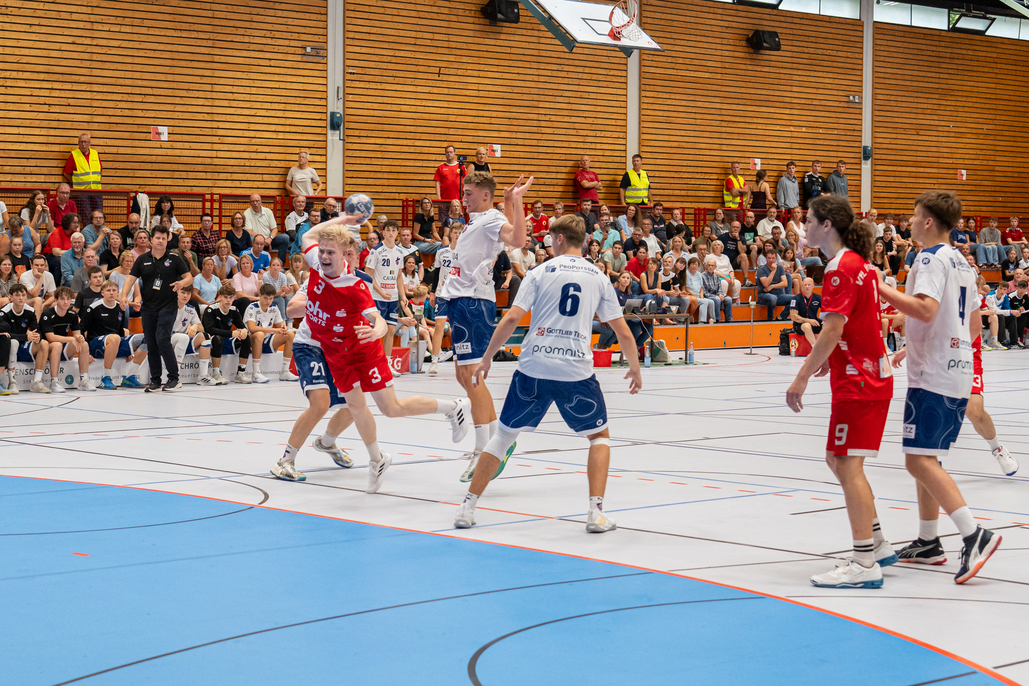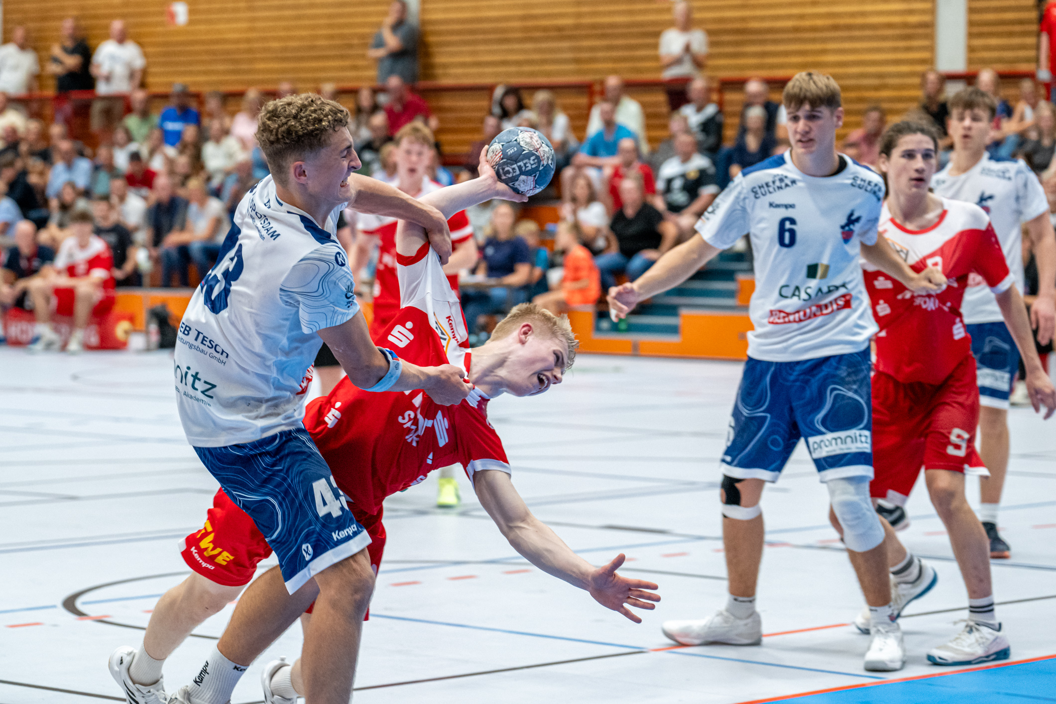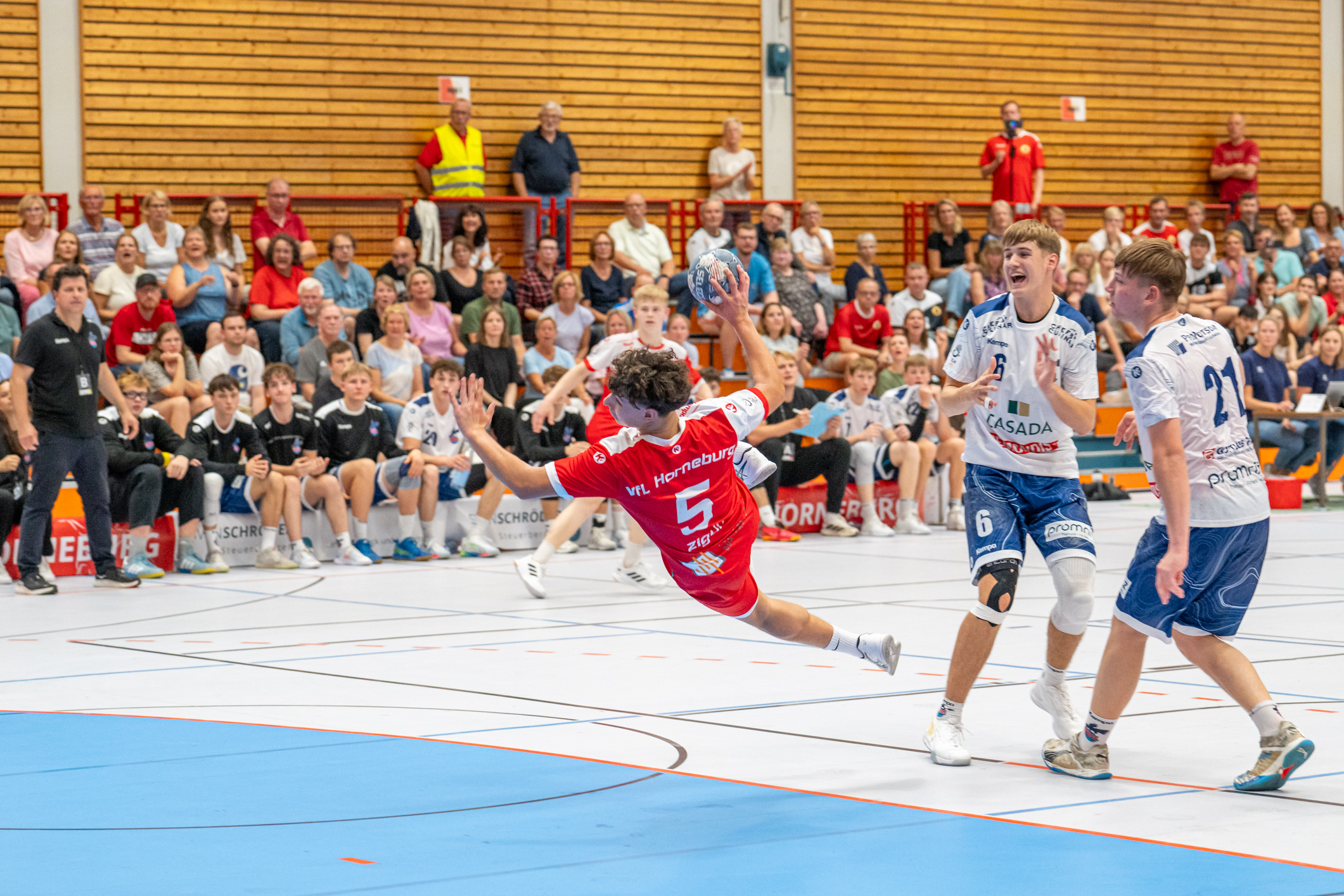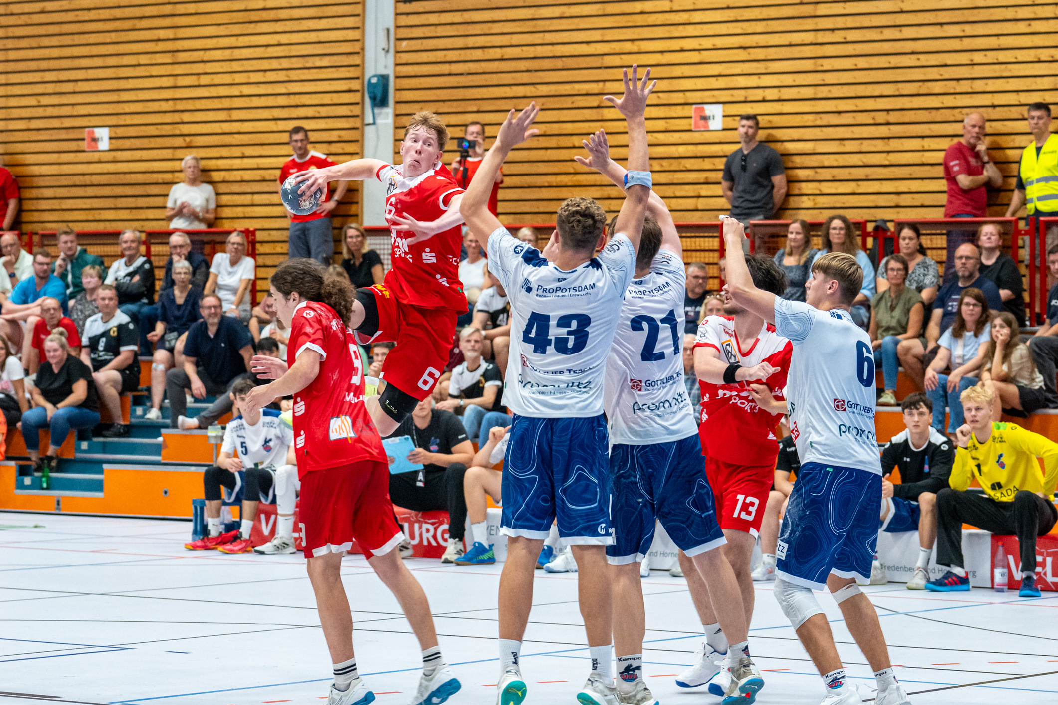 Das erste Heimspiel der 1. Liga Saison endete für die männliche Jugend A mit einer 30:33 (15:16) Niederlage gegen den VfL Potsdam. Dabei zeigte sich das Horneburger Team in den ersten 15 Spielminuten zu passiv und musste die Gäste zu einer fünf Tore-Führung wegziehen lassen. Zu allem Überfluss verletzte sich in dieser Spielphase auch noch Rechtsaußen Max Wegener, der ausschied. Eine Untersuchung im Krankenhaus diagnostizierte einen Bruch des Handgelenks. Von dieser Stelle die besten Genesungswünsche an Max, der voraussichtlich mindestens zwei Monate dem Team nicht zur Verfügung steht. Im letzten Drittel der ersten Halbzeit konnte sich das Heimteam steigern und kam, angeführt vom überragenden Torschützen Josua Schleßelmann (9 Tore), zum 15:16 Halbzeitstand. Bis zum Spielstand von 24:24 konnte das Team der Trainer Carsten Brinkmann und Stefan Hagedorn das Spiel dank einiger sehenswerter Rückraumtreffer von Christoph Eick (5 Tore) ausgeglichen gestalten, bis Potsdam wieder auf eine Drei-Tore Führung wegziehen konnte.