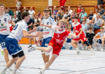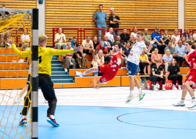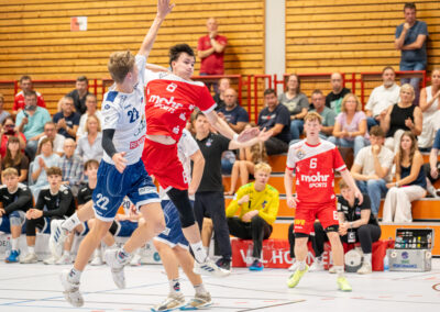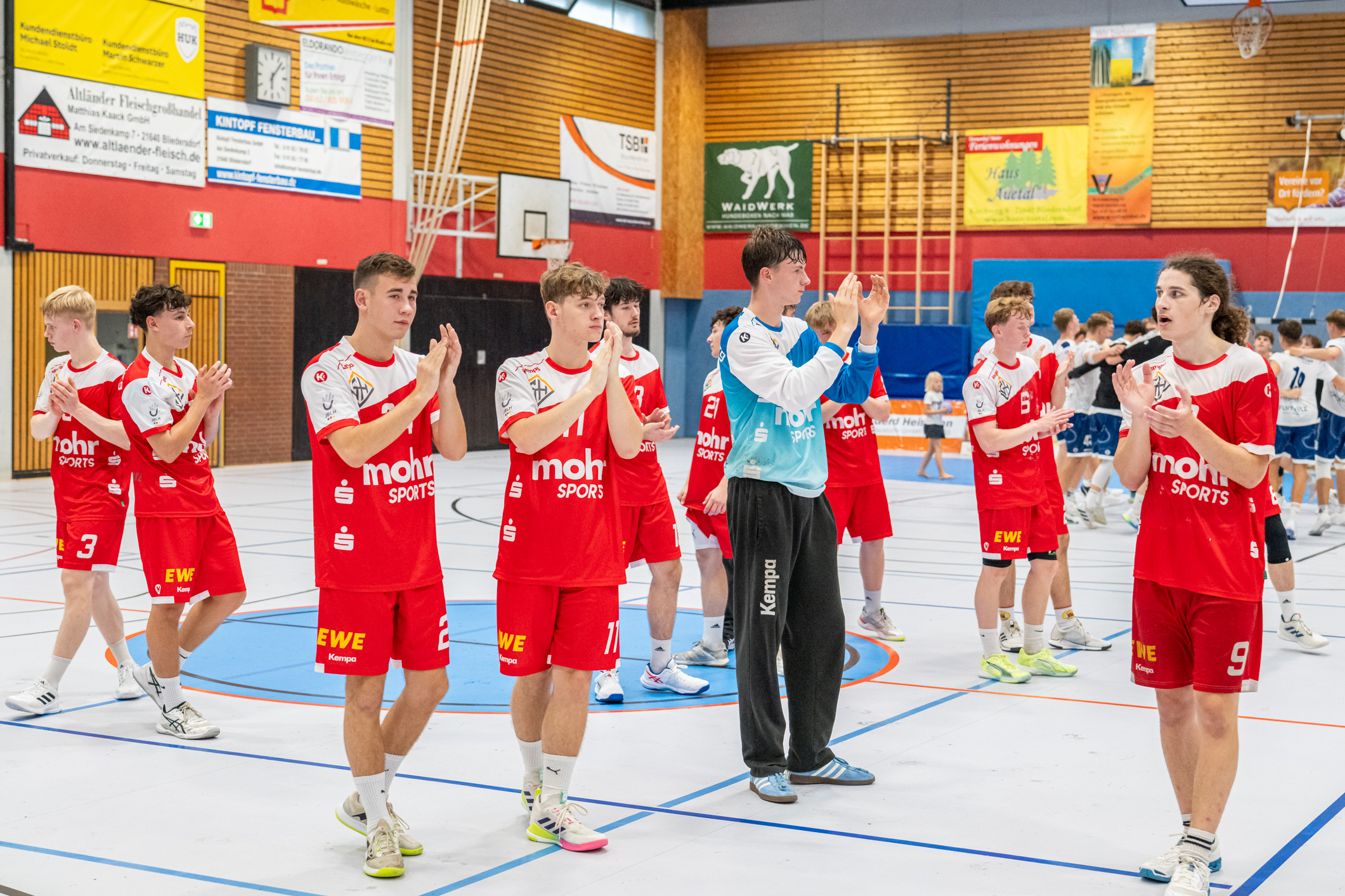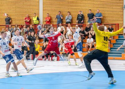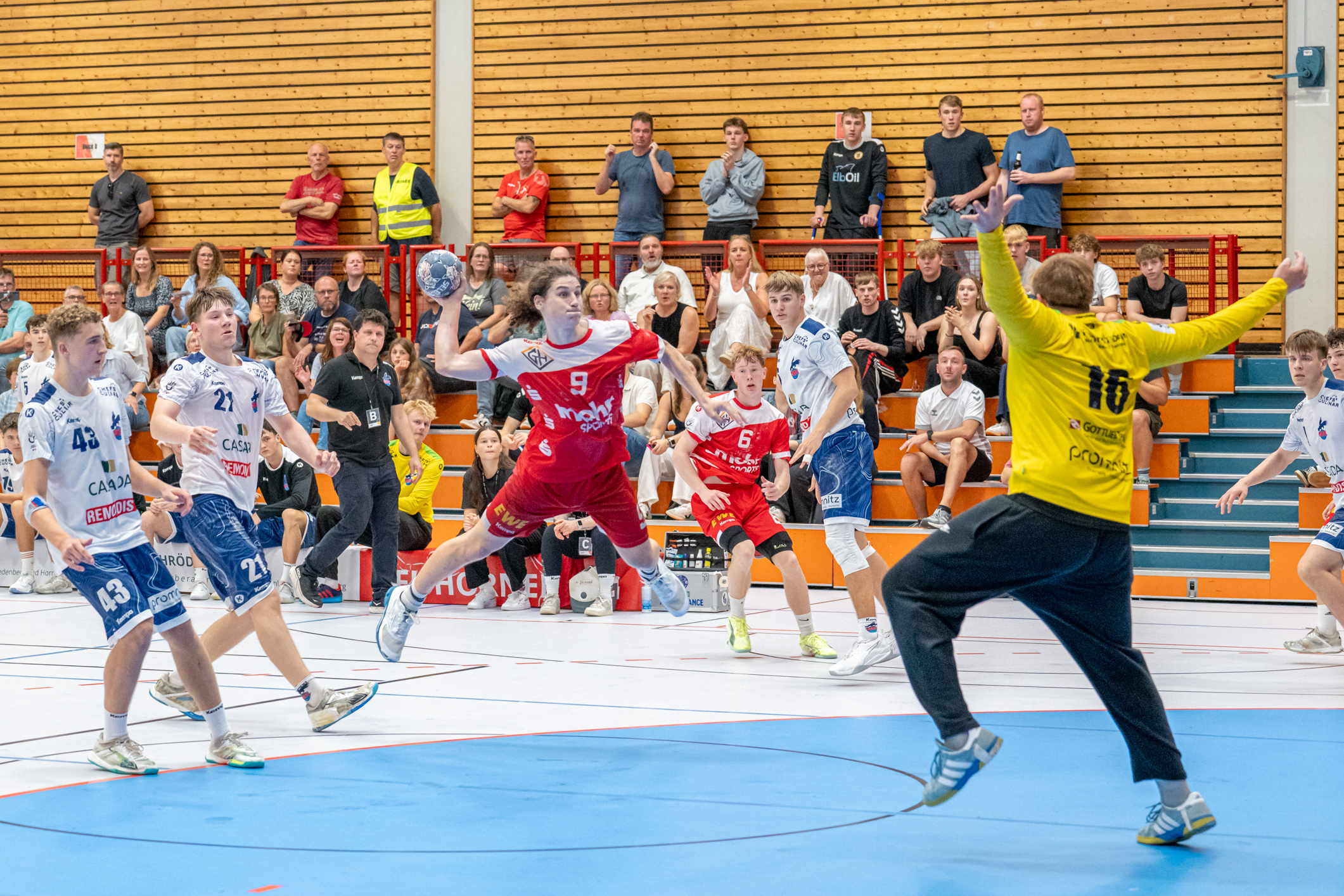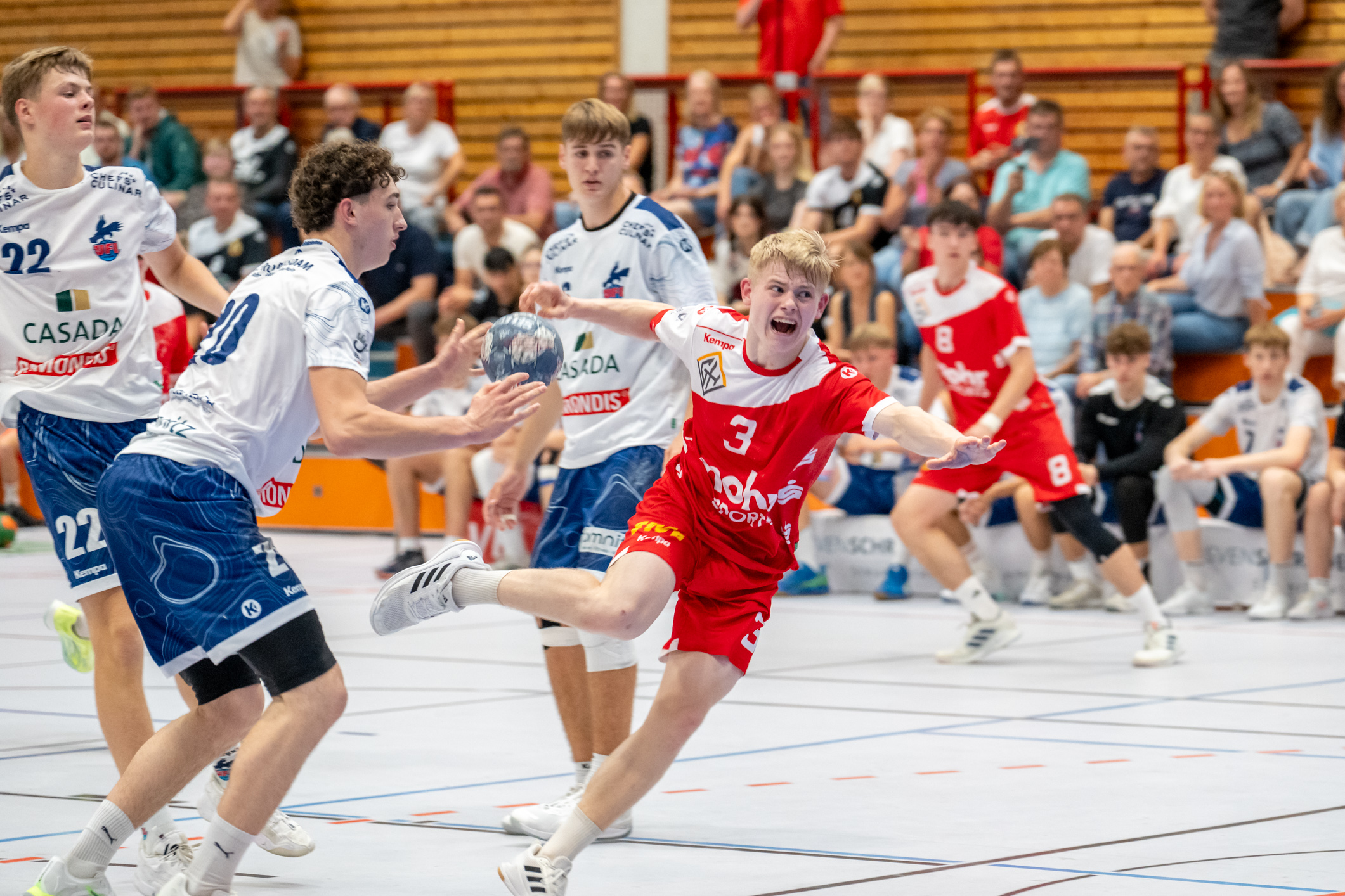 Das erste Heimspiel der 1. Liga Saison endete für die männliche Jugend A mit einer 30:33 (15:16) Niederlage gegen den VfL Potsdam. Dabei zeigte sich das Horneburger Team in den ersten 15 Spielminuten zu passiv und musste die Gäste zu einer fünf Tore-Führung wegziehen lassen. Zu allem Überfluss verletzte sich in dieser Spielphase auch noch Rechtsaußen Max Wegener, der ausschied. Eine Untersuchung im Krankenhaus diagnostizierte einen Bruch des Handgelenks. Von dieser Stelle die besten Genesungswünsche an Max, der voraussichtlich mindestens zwei Monate dem Team nicht zur Verfügung steht. Im letzten Drittel der ersten Halbzeit konnte sich das Heimteam steigern und kam, angeführt vom überragenden Torschützen Josua Schleßelmann (9 Tore), zum 15:16 Halbzeitstand. Bis zum Spielstand von 24:24 konnte das Team der Trainer Carsten Brinkmann und Stefan Hagedorn das Spiel dank einiger sehenswerter Rückraumtreffer von Christoph Eick (5 Tore) ausgeglichen gestalten, bis Potsdam wieder auf eine Drei-Tore Führung wegziehen konnte.