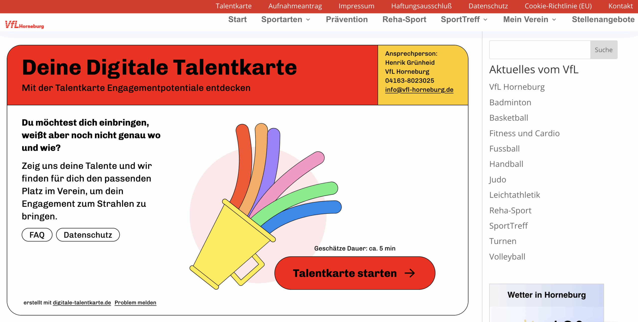 Der VfL Horneburg hat eine neue Initiative zur Suche von aktiven Unterstützer/innen gestartet. Zusammen mit dem Kreissportbund wurde ein interaktiver Fragebogen entwickelt, den Interessierte über die Internetseiten des VfL unter https://vfl-horneburg.de/mein-verein/digitale-talentkarte-wir-brauchen-dich/ aufrufen können.
